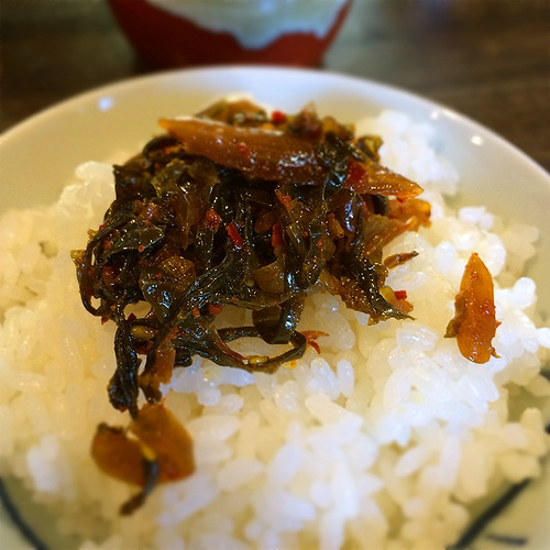 そして、白いご飯の上には、ラーメンの薬味として置いてある辛し高菜をたっぷり乗せて食べます。ラーメンと同じくらい楽しみ♪